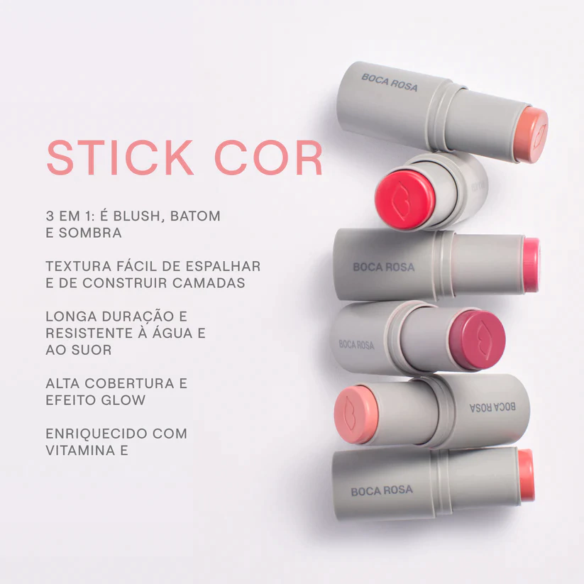 Nosso Stick Cor pode ser usado como blush, sombra e batom, proporcionando praticidade e versatilidade para qualquer ocasião. Com uma textura cremosa que desliza suavemente e um acabamento glow impecável, ele realça sua beleza de dia e de noite. Disponível em 6 cores, é um produto vegano e enriquecido com vitamina E, para mais cuidado com a sua pele!